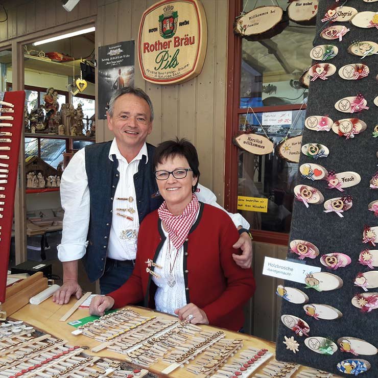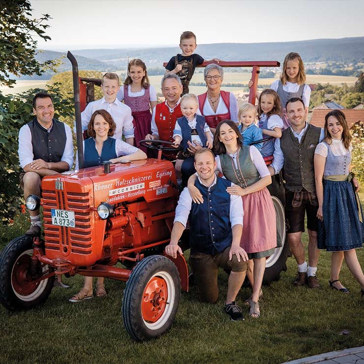 Die Liebe zum Holzschnitzen liegt in unserer Familie. Wir, die Holzschnitzerei Eyring, können auf eine lange Tradition zurückblicken. Bereits vor vier Generationen begann Erhard Eyring in einem alten Bauernhaus mit der Holzschnitzerei. Schon bald stieg sein Sohn Isidor Eyring in das Geschäft ein. In einem Wohnhaus mit kleiner Werkstatt verkaufte er vor allem kleine Figuren, bäuerliche Darstellungen wie Nickmännchen, geschnitzte Nadelkissen und vor allem Honey-Wagen, Bierwagen oder Jauchewagen. Zu den Hauptkunden zählten hauptsächlich die hier stationierten Amerikaner, die viel Freude an solchen handwerklichen Produkten hatten. Die Familientradition wurde fortgeführt, und so übernahm Gerold Eyring, der Sohn von Isidor, den Betrieb.