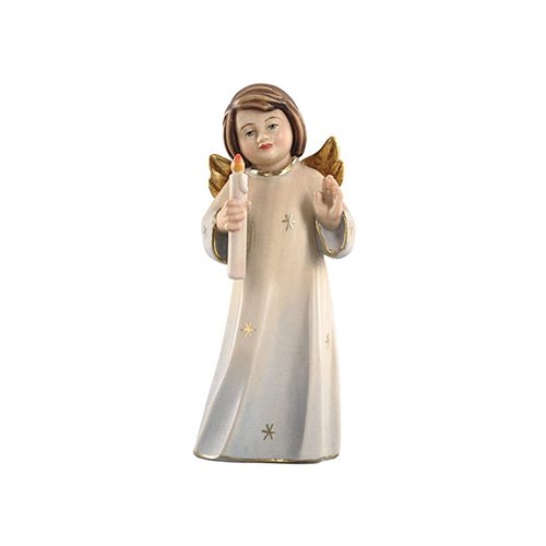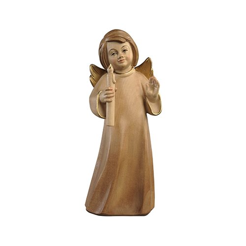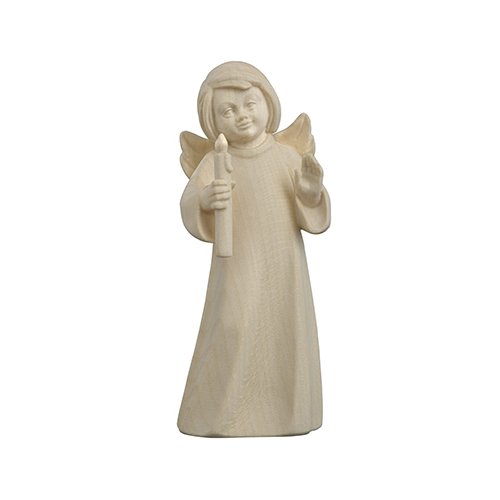 Geschnitzte Engelsfigur mit Kerze – erhältlich in naturbelassener, gebeizter oder handbemalter Ausführung. Zwei Größen: 10,5 cm und 15 cm.