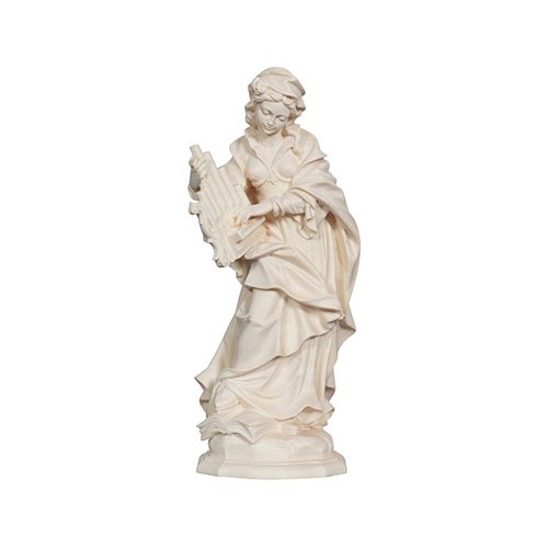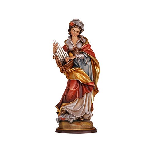 Diese filigrane Darstellung zeigt die Heilige Cäcilia, Patronin der Kirchenmusik, wie sie eine tragbare Orgel (Portativ) in der Hand hält und auf einem geöffneten Buch steht – Sinnbild für ihren Lobpreis und ihre Musikalität