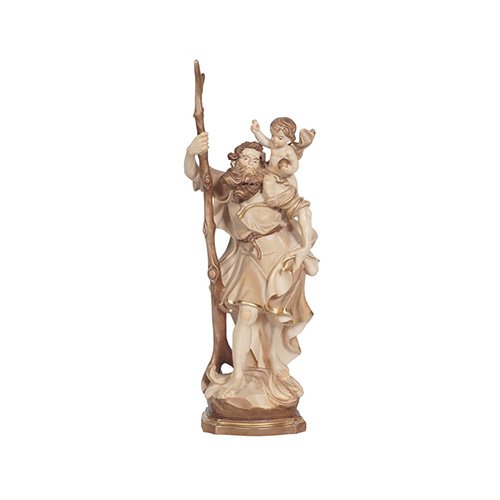 Geschnitzte Figur des Heiligen Christophorus mit Wanderstock und Jesuskind auf der Schulter – wahlweise naturbelassen, gebeizt oder kunstvoll bemalt. In drei Größen erhältlich.