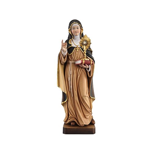 Heiligenfigur aus Holz der Heiligen Klara mit Bibel und Monstranz – naturbelassen, gebeizt oder kunstvoll bemalt. In drei Größen erhältlich.