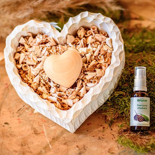 Set: Herzschale mit Zirbenspänen, Zirbenherz und Zirbelkiefer Raumspray