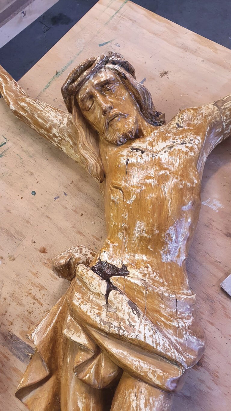 Nach der Reinigung folgt die eigentliche Restaurierung. Das kann das Füllen von Rissen, das Stabilisieren oder Ersetzen von beschädigten Teilen sowie eine Neubemalung umfassen.